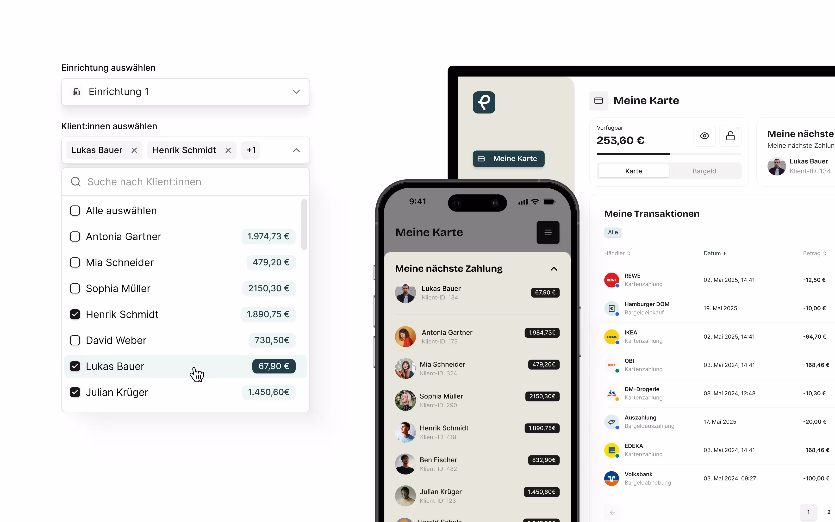 Ein klares Nein. Wenn Klient:innen in der Lage ist, selbständig das eigene verfügbares Guthaben zu verwalten und auszugeben, sind diese Transaktionen ausschließlich in der persönlichen Nutzungsansicht sichtbar. Mitarbeitende oder gesetzliche Betreuer haben keinen Zugriff auf die Details dieser Ausgaben. Wir anonymisieren die Transaktionen, um Guthaben, Salden und Kontoauszüge korrekt darzustellen, wobei nur der Betrag der Ausgabe angezeigt wird.